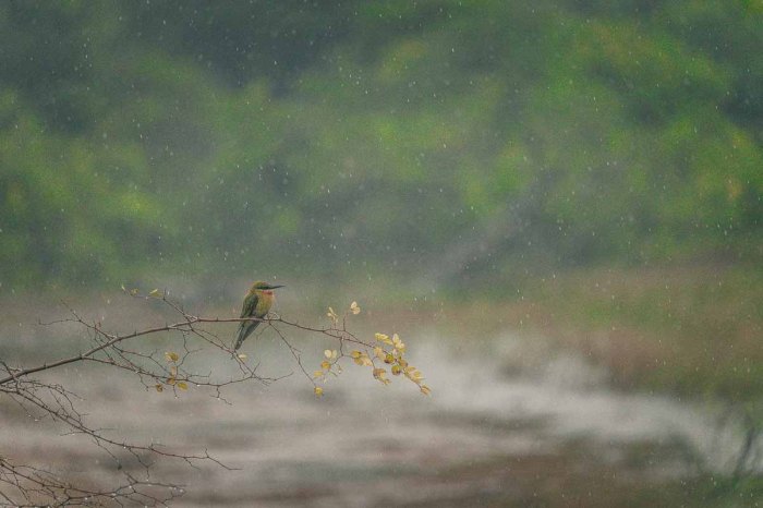 Notre safari démarre sous la pluie ; pas sous les meilleures auspices, donc. On aperçoit tout de même de nombreux animaux : des buffles qui semblent apprécier les flaques d’eau, des crocodiles, des daims, un éléphant solitaire, des oiseaux, et pour finir une famille d’éléphants avec son petit ! Pas de léopard en vue, cependant. Il pointe le bout de sa queue, paraît-il, plutôt en fin de journée, pour aller rassasier son estomac.